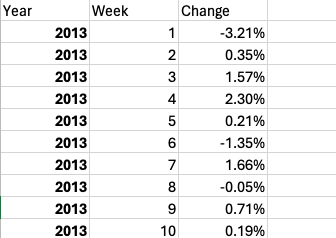 Response: The average weekly return across all weeks in the 10-year period was approximately 0.56%. In comparison, the average return in the week following a week with a loss was about 0.89%. This indicates that, on average, weeks following a loss tended to perform better than the overall average, suggesting a pattern of recovery or rebound after down weeks.
